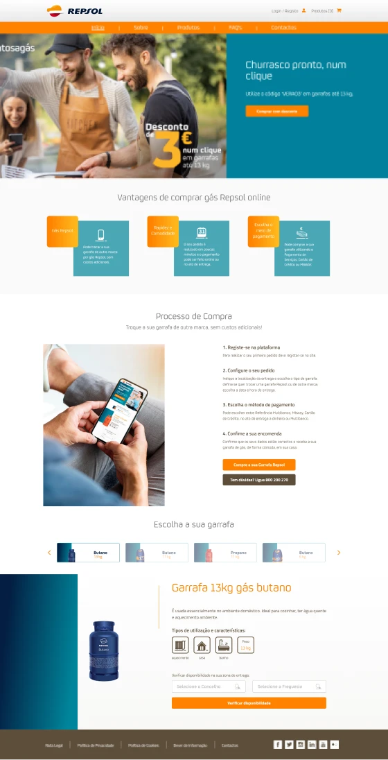 Una plataforma que permite la compra de gas propano o butano es la gran apuesta de Repsol, asegurando la entrega en casa de sus clientes. Un proyecto realizado por nuestro equipo de UX y UI, que desarrolló el diseño del sitio web, y por nuestro equipo de programación, que concibió esta plataforma para que pueda operar en toda el área de Portugal Continental, haciendo que el proceso de compra sea más cómodo y rápido para todos los clientes.